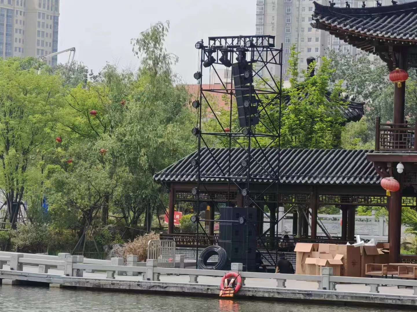 El sistema de sonido de matriz lineal dual de 12" EL2123 de Tasso Audio está ubicado alrededor del lago, con un área para el público y un área para presentaciones. La distancia más lejana en línea recta es de 185 metros y el área cubre 60000 metros cuadrados.