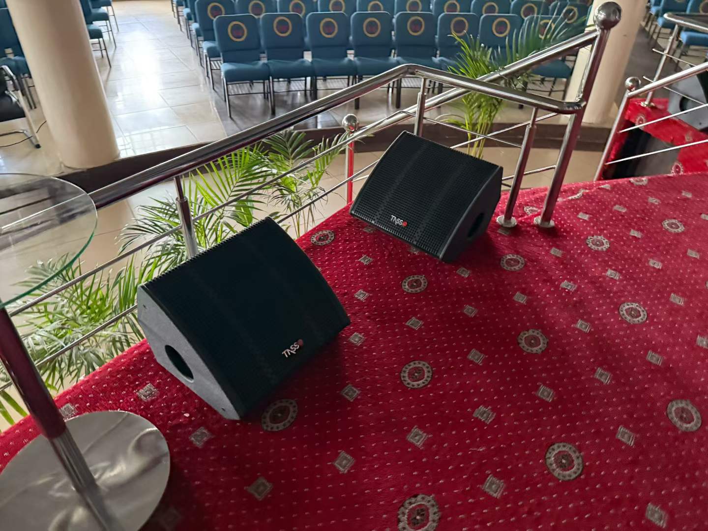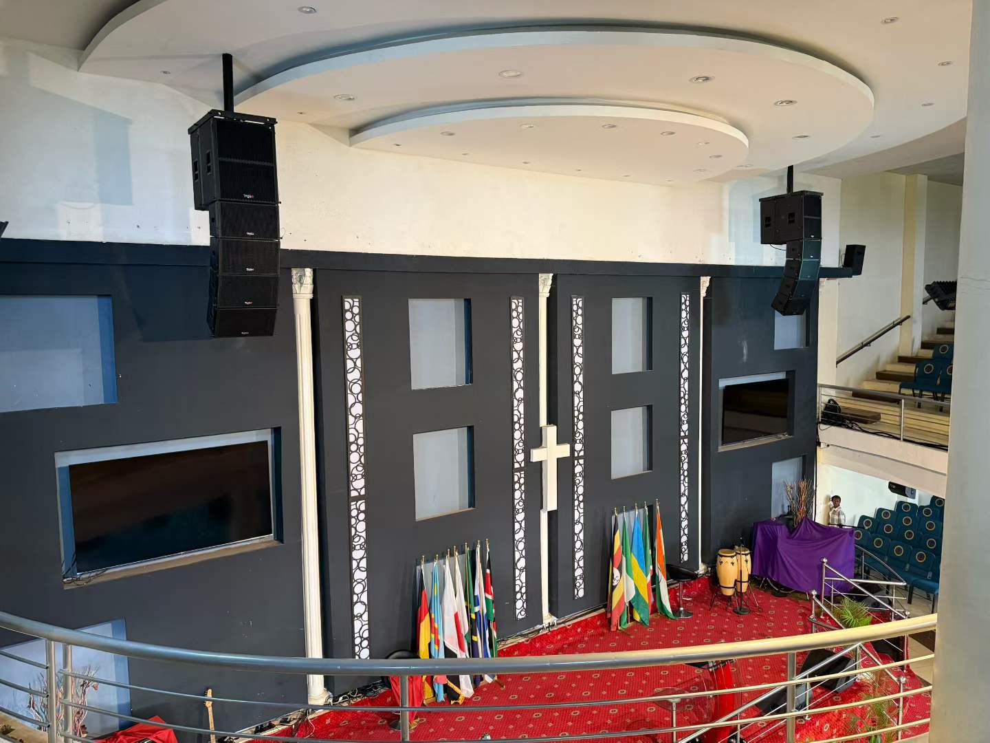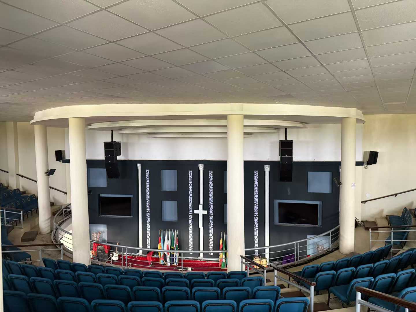 8 altavoces lineales de 10 pulgadas de la serie Tasso T + 2 altavoces ultrabajos activos T-sub18, colgados a ambos lados del escenario en una combinación de oro 4 + 1. La tecnología de matriz lineal permite una cobertura precisa de las ondas sonoras: la fila delantera no es ruidosa, la fila trasera es clara y el sonido es como descendiendo del cielo, extendiéndose uniformemente por todo el pasillo.
