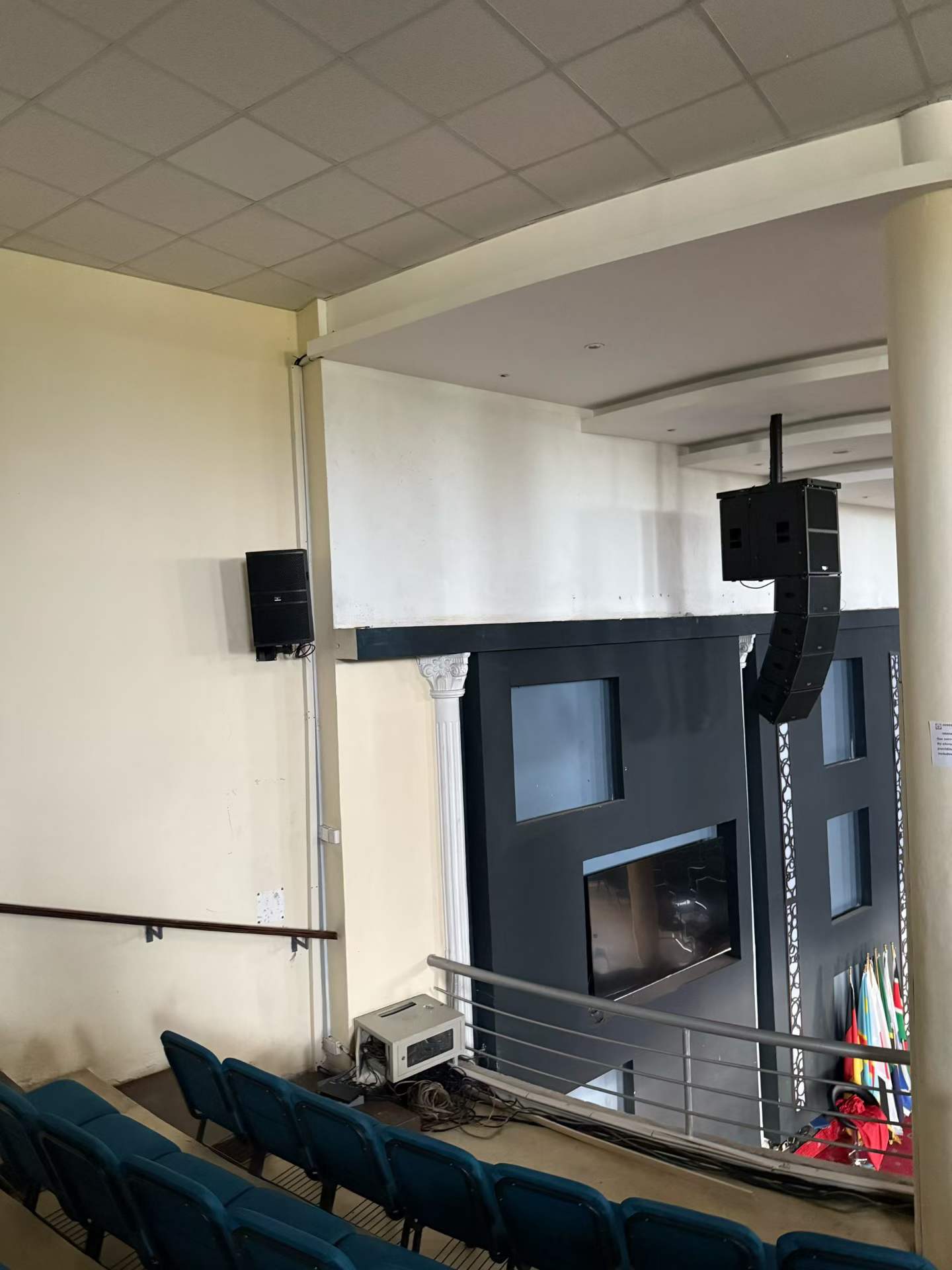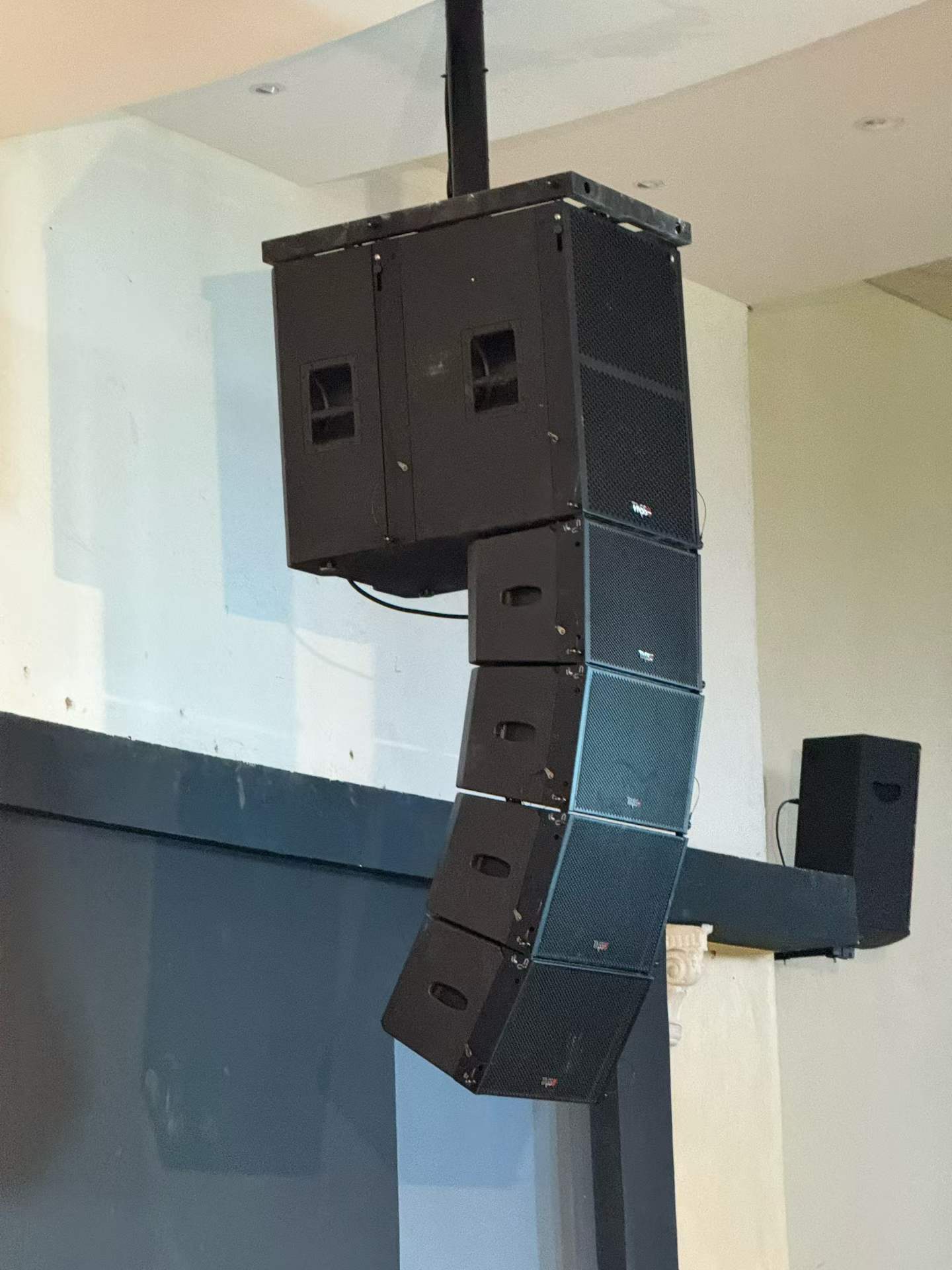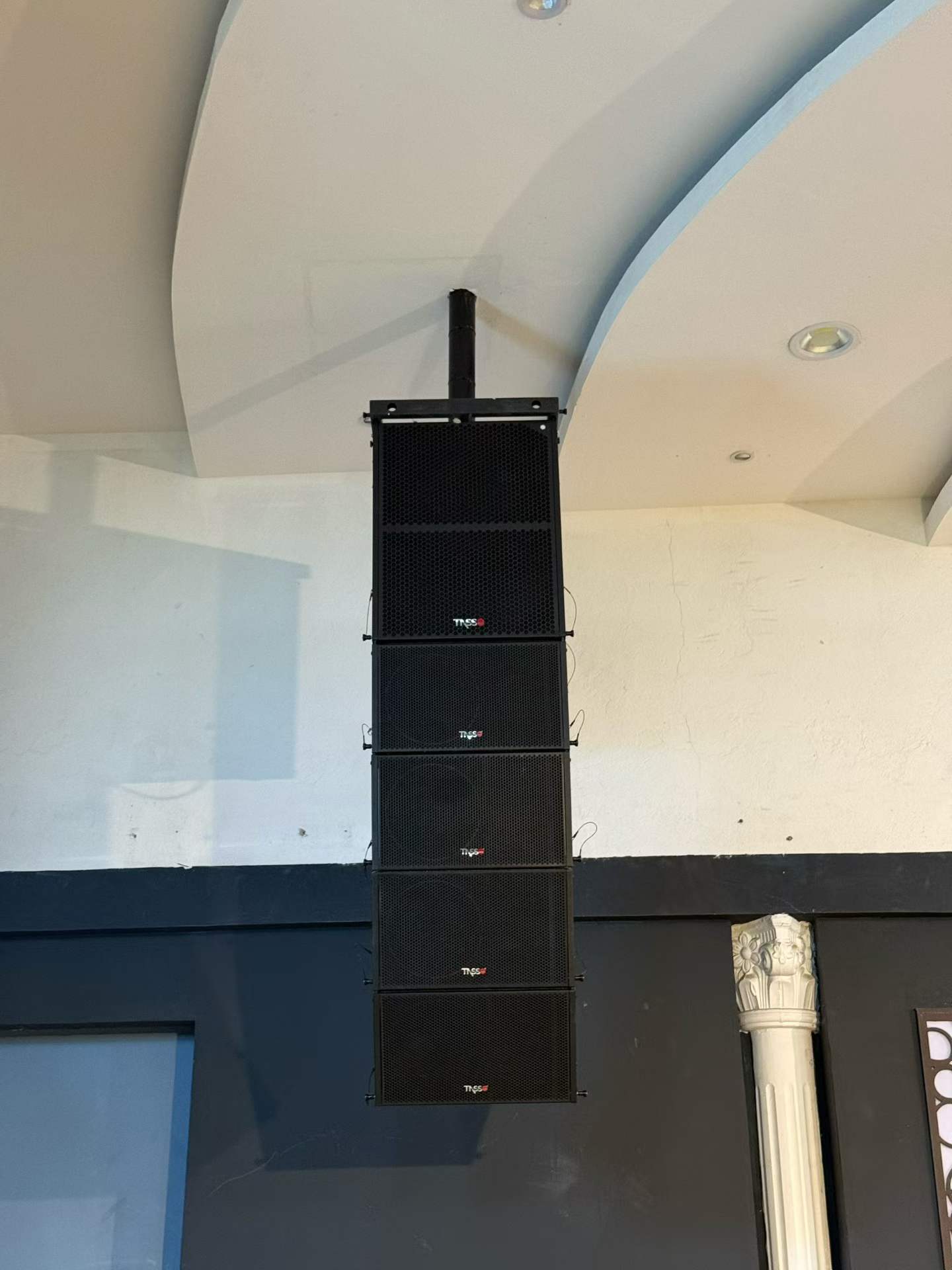 8 altavoces lineales de 10 pulgadas de la serie Tasso T + 2 altavoces ultrabajos activos T-sub18, colgados a ambos lados del escenario en una combinación de oro 4 + 1. La tecnología de matriz lineal permite una cobertura precisa de las ondas sonoras: la fila delantera no es ruidosa, la fila trasera es clara y el sonido es como descendiendo del cielo, extendiéndose uniformemente por todo el pasillo.