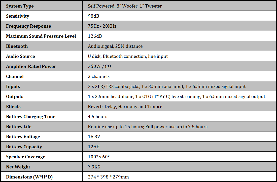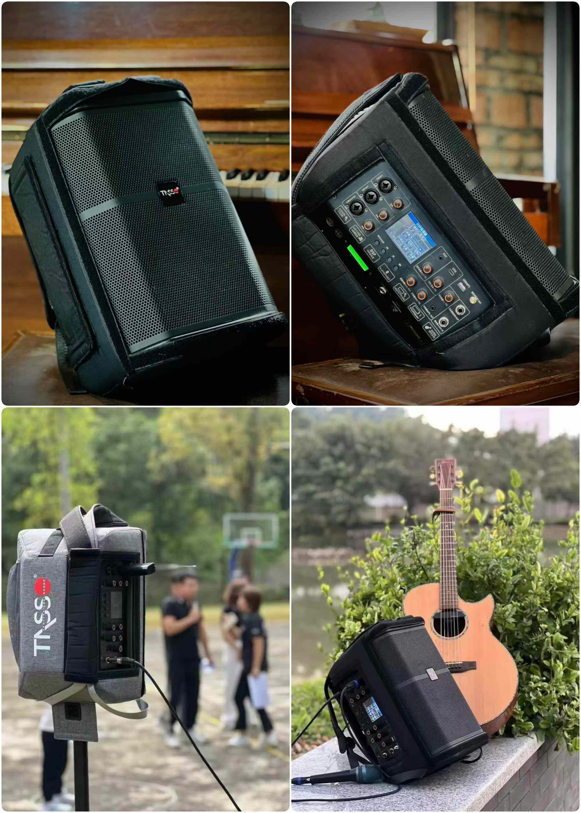 M8+ Es un sistema integrado de amplificador de potencia alimentado por batería y ultraportátil, equipado con fuente de alimentación de batería recargable, audio bluetooth, micrófono y acceso a instrumentos musicales, equipado con un mezclador de 3 canales, que proporciona funciones independientes de volumen, control de timbre, reverberación y coro de guitarra; Sin depuración profesional y técnica, se pueden realizar fácilmente escenas de aplicación como apreciación de música interior y exterior / karaoke / transmisión en vivo / pequeños espectáculos / interpretación de guitarra y canto.
