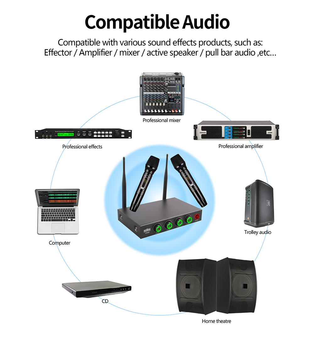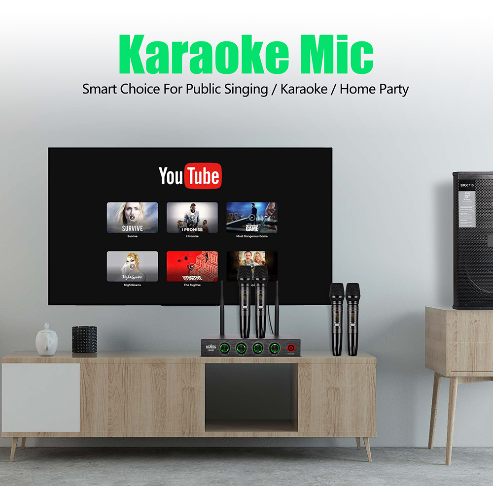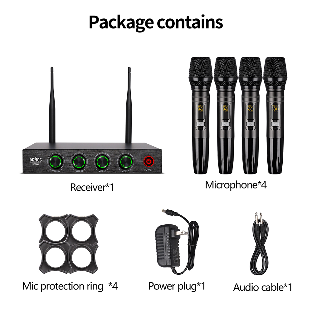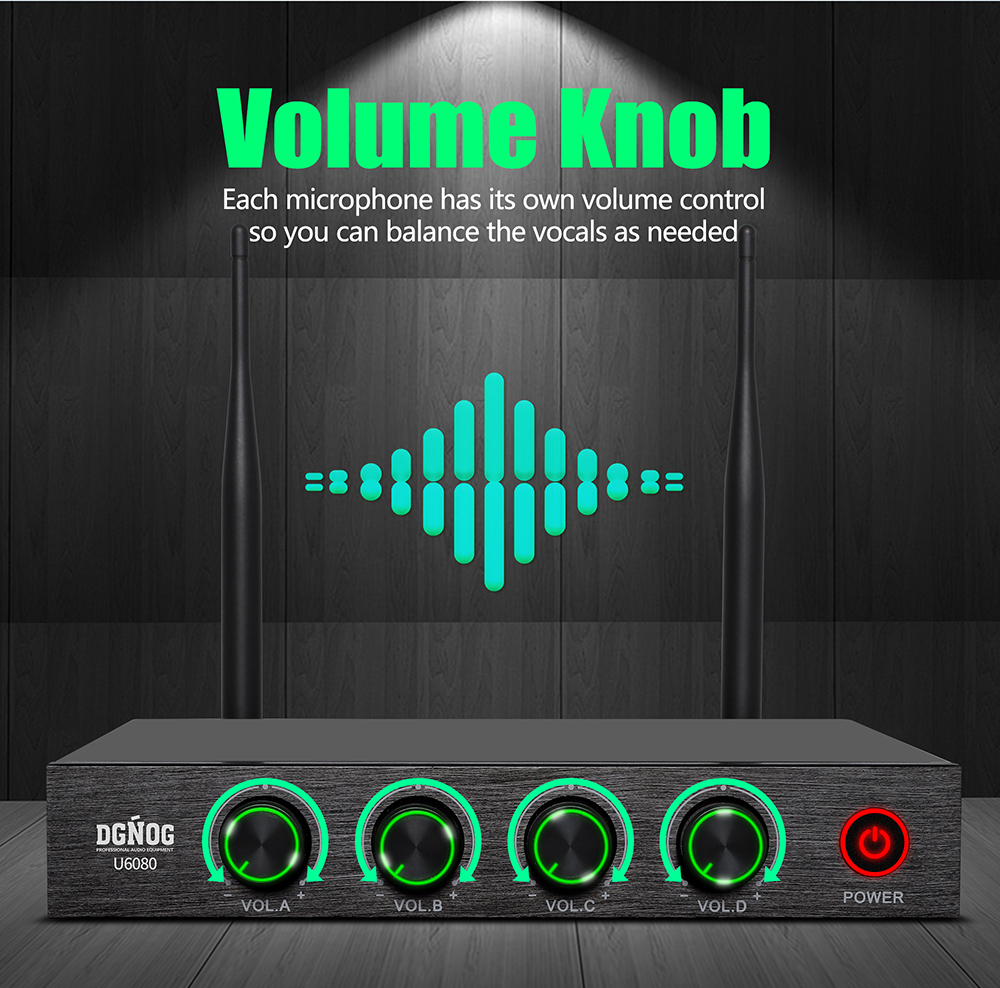 【Calidad de sonido clara y pura】- El sistema profesional de micrófono inalámbrico de 4 canales u6080 está equipado con un movimiento profesional en forma de corazón para reproducir un sonido mejor, claro, puro y completo. Karaoke, fiesta familiar, dj, boda, iglesia.