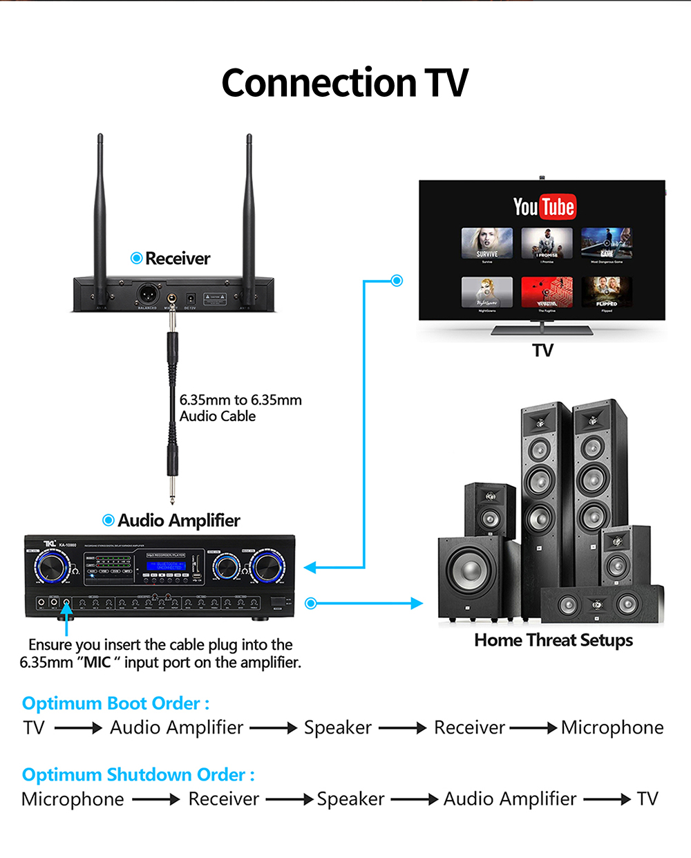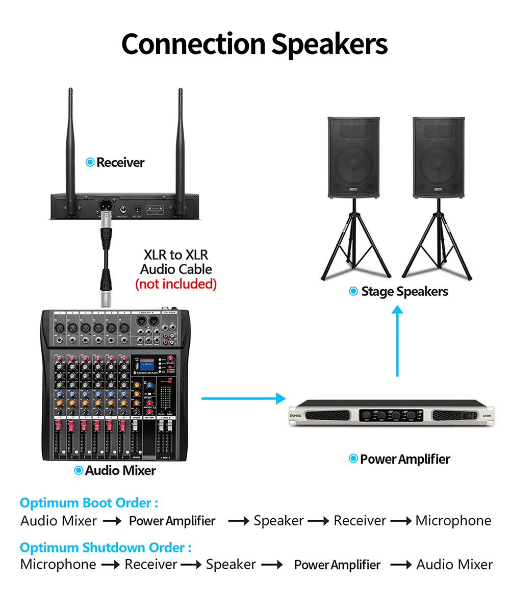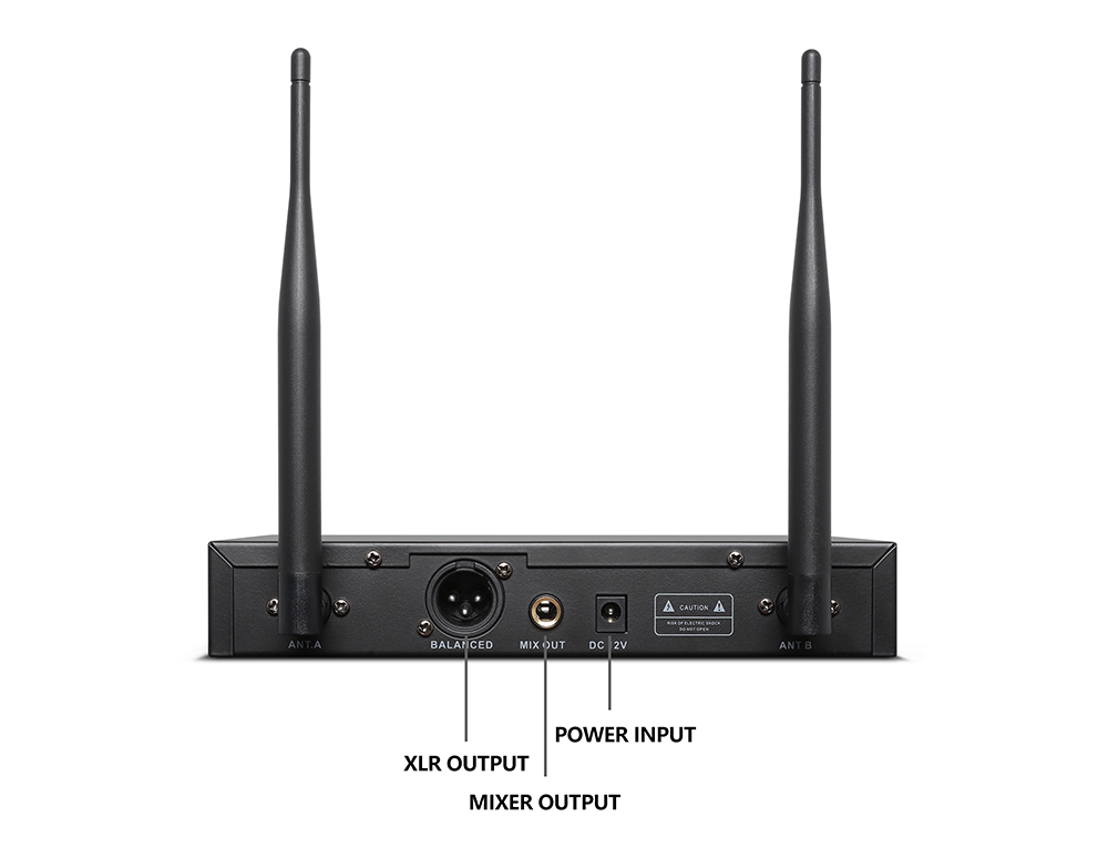 【Fácil de configurar】- Configurar fácilmente el sistema de micrófono inalámbrico, plug - and - play, después de que el micrófono y el receptor estén electrificados, el micrófono se conecta automáticamente al receptor, y el canal correspondiente a la perilla de volumen se iluminará en Verde.