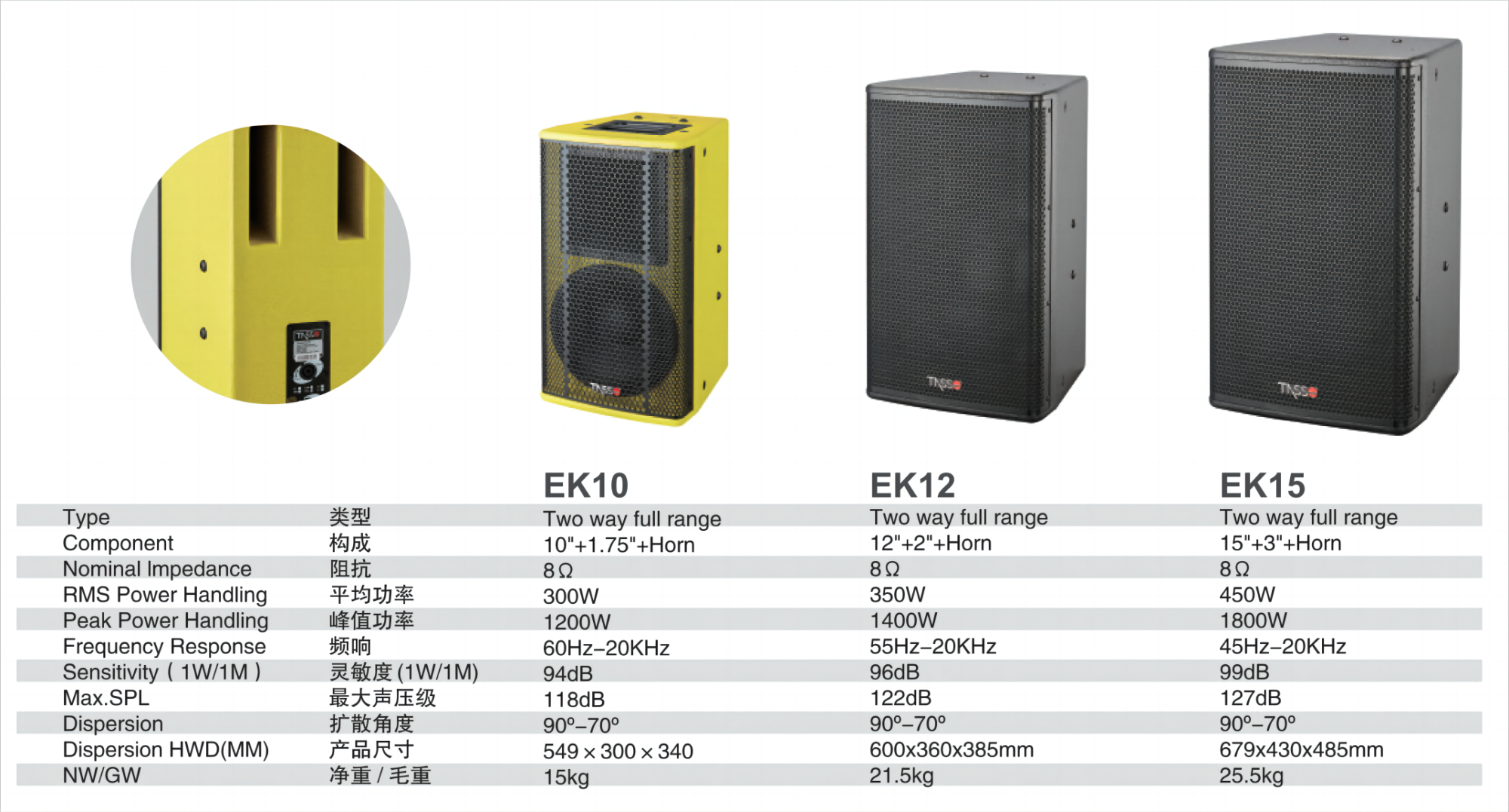 Los altavoces de la serie EK están diseñados especialmente para espacios de fiesta pequeños y medianos, ofreciendo un aspecto personalizado para coincidir con cualquier decoración. Los modelos EK10, EK12 y EK15 cubren tamaños de 10 a 15 pulgadas y tienen un diseño y características acústicas similares, que varían principalmente en términos de respuesta de frecuencia y nivel de presión acústica. Están equipados con una variedad de opciones de instalación para facilitar la instalación y están adaptados al karaoke para garantizar una experiencia de audio inmersiva. La serie EK tiene una calidad y fiabilidad de primera clase y se adapta perfectamente a las necesidades de sonido de su Sala de fiestas.