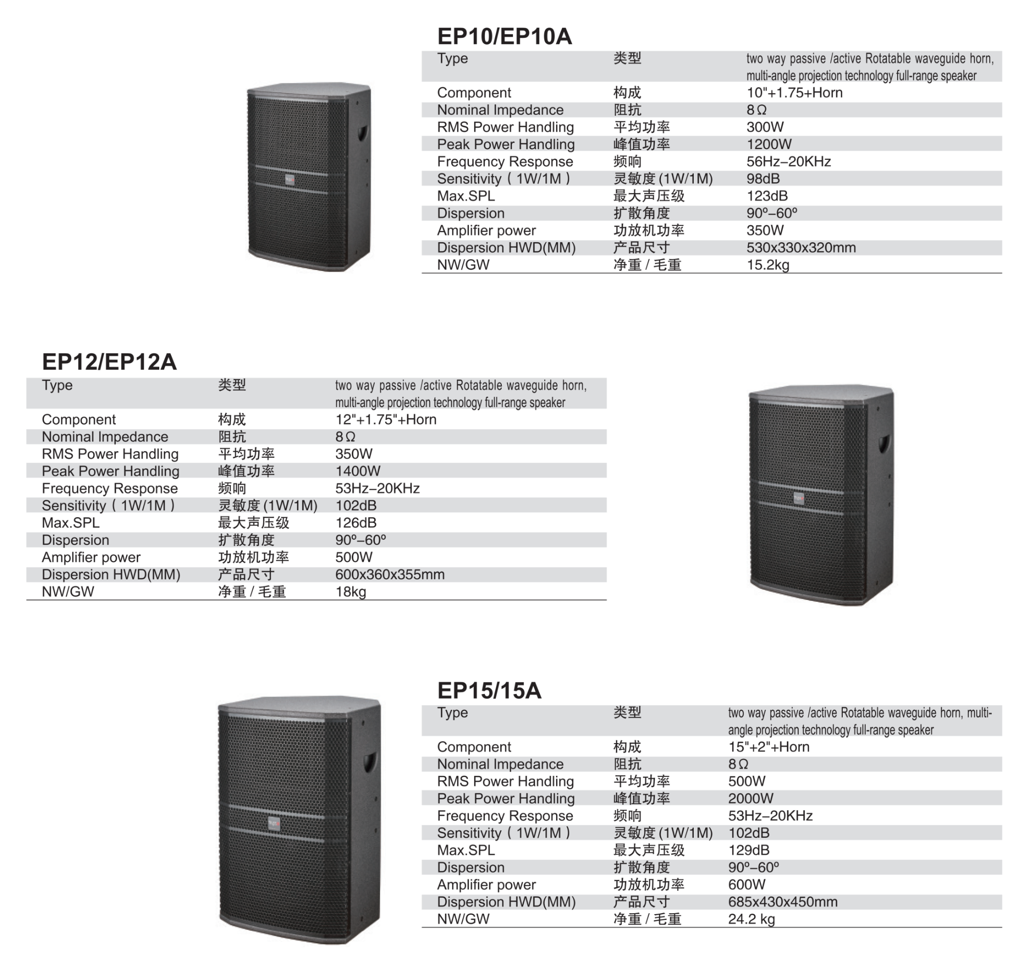 El EP representa una frase en inglés que significa "mejorar el rendimiento". La colección consta de tres modelos: EP10, EP12 y EP15. Estos modelos tienen características estéticas, sonoras y acústicas de diseño similares, con solo diferencias de tamaño y nivel de presión acústica de salida, lo que permite a los usuarios seleccionar altavoces perfectos para aplicaciones específicas.
