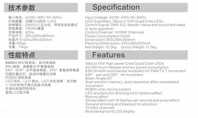 Luz LED de cabeza móvil ETY-104 de 36 x 10 W