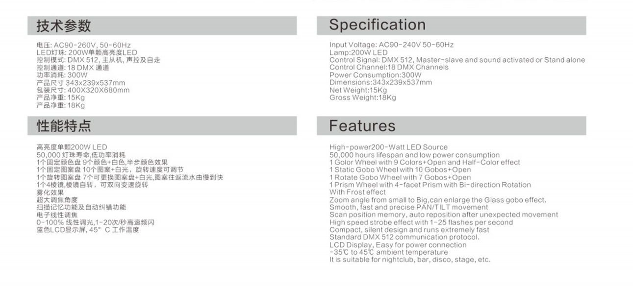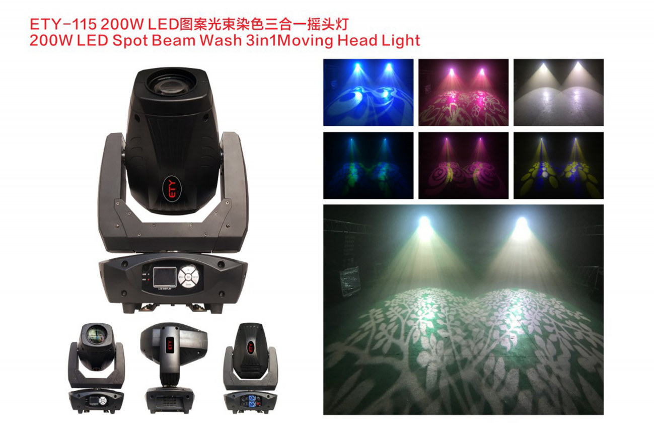 Foco LED de haz puntual 3 en 1 ETY-115 de 200 W con cabezal móvil