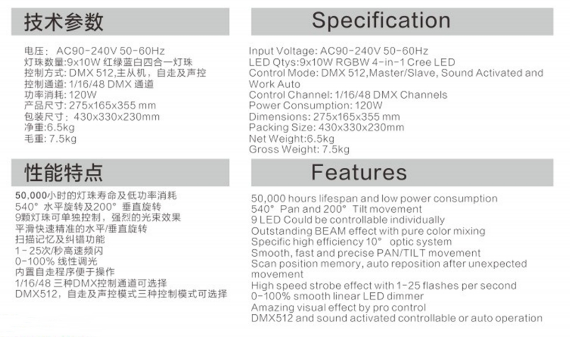 Luz de cabeza móvil con haz de mapeo de píxeles ETY-130 de 9 x 10 W