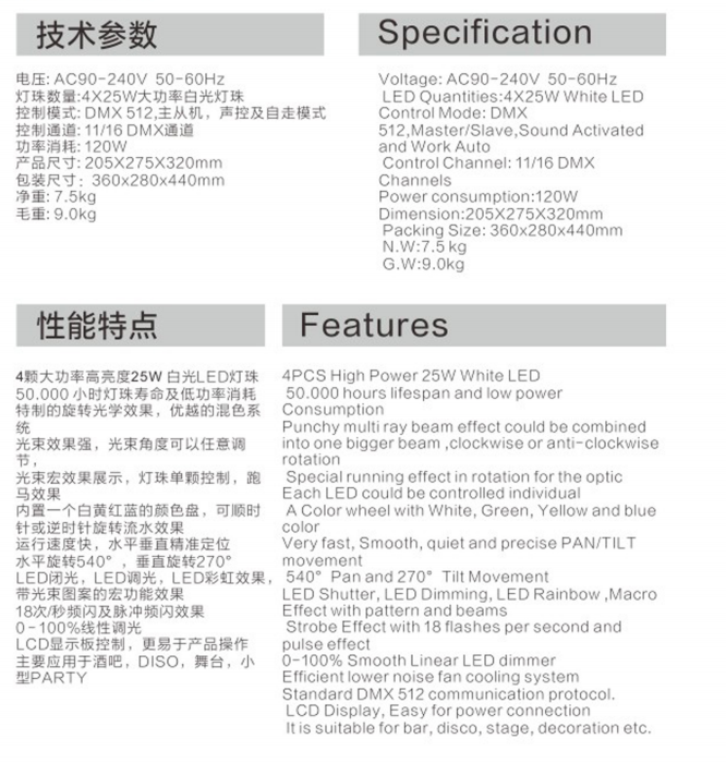 Luz de cabeza móvil LED de haz superrápido ETY-135 de 4 x 25 W
