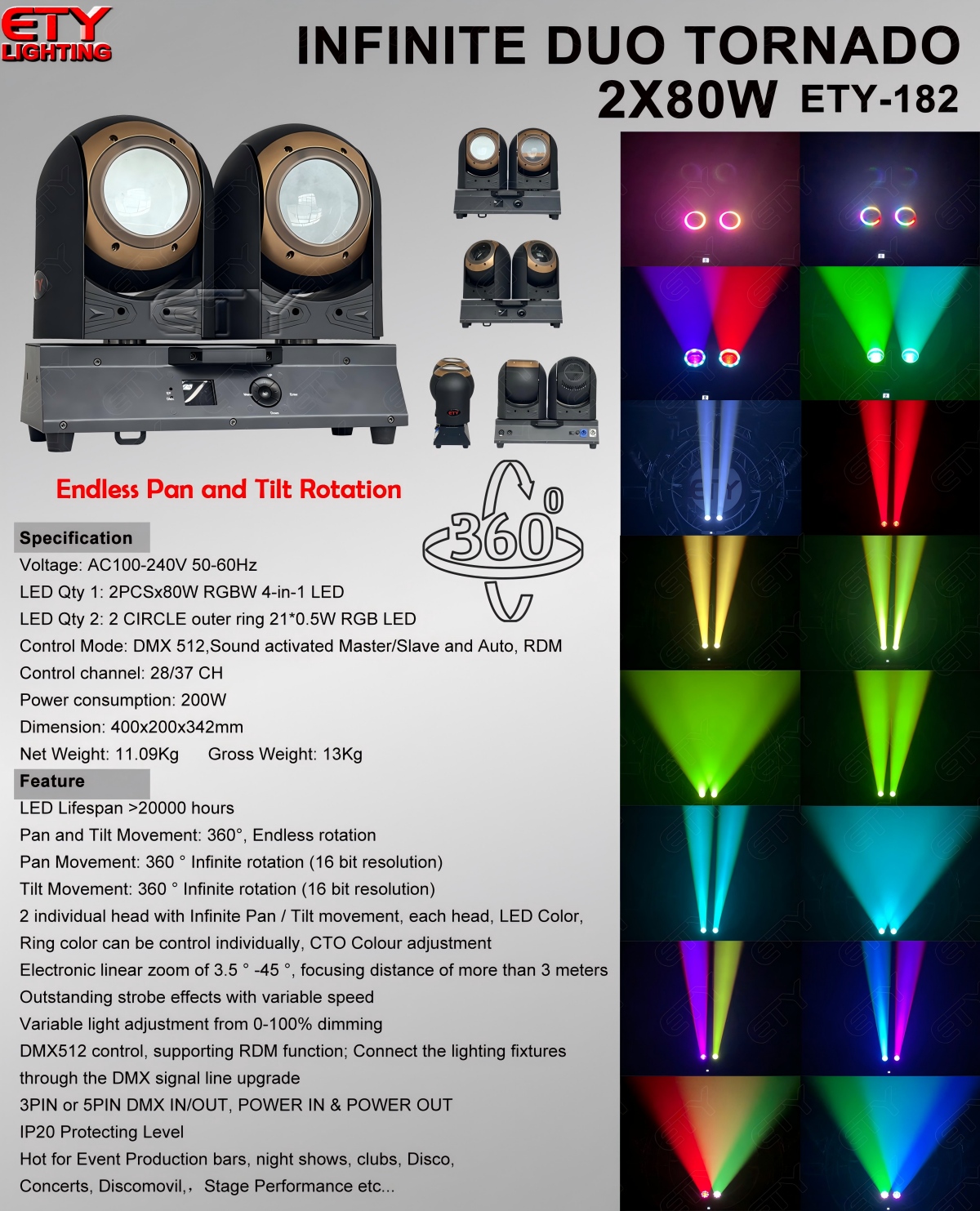 ETY-182 2X80W INFINITE DUO TORNADO Endless Pan and Tilt Rotation