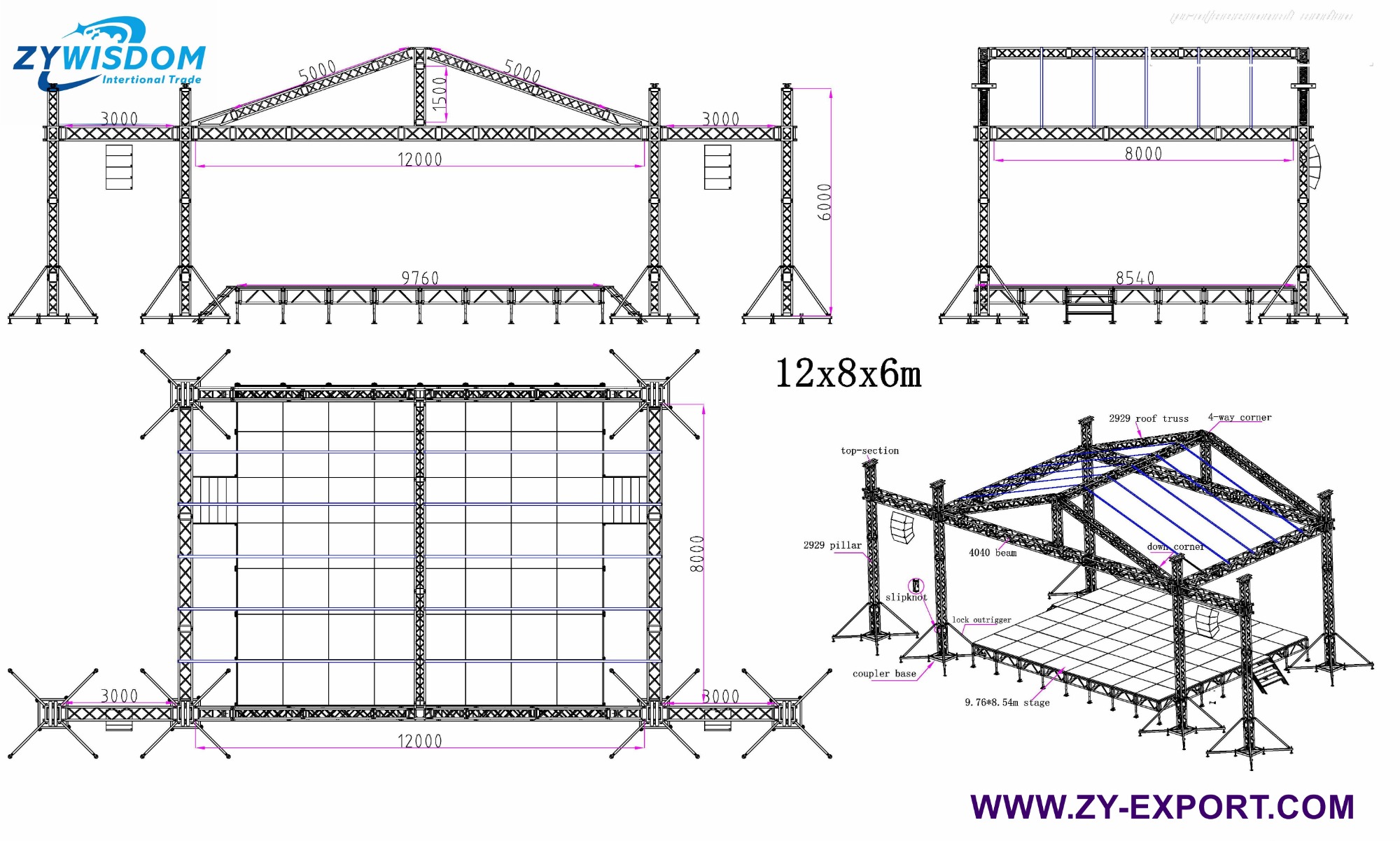 ZY International Eventos profesionales en interiores y exteriores, escenario y armazón personalizados de diferentes tamaños.