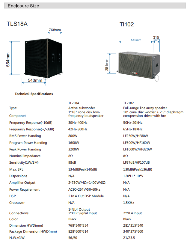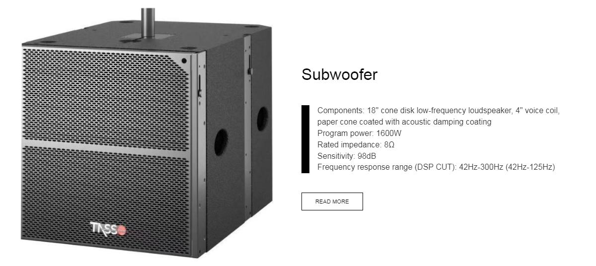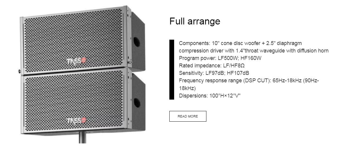 El número de sistemas T-Lite se configura como 1+2 o un múltiplo entero de esta configuración, es decir, 1 caja de altavoz de baja frecuencia activa emparejada con 2 cajas de altavoces de frecuencia completa de matriz en línea; al expandir el sistema, es necesario aumentar el número en múltiplos de acuerdo con esta norma. Se pueden combinar varios grupos de sistemas de altavoces para expandirse en sistemas con niveles de presión sonora más altos. Continuando con el concepto de integración de T2, los módulos amplificadores de potencia integrados T-Lite se instalan uniformemente dentro del subwoofer, y los módulos de frecuencia completa están diseñados como pasivos. El nivel máximo de presión sonora de un solo sistema estándar es tan alto como 133dB (pico), con un rango de respuesta de frecuencia de 42Hz-18kHz y un rango de cobertura horizontal de 100°. Todo el sistema está rociado con un revestimiento protector de poliurea y es consistente con la garantía de calidad de los productos Tasso.