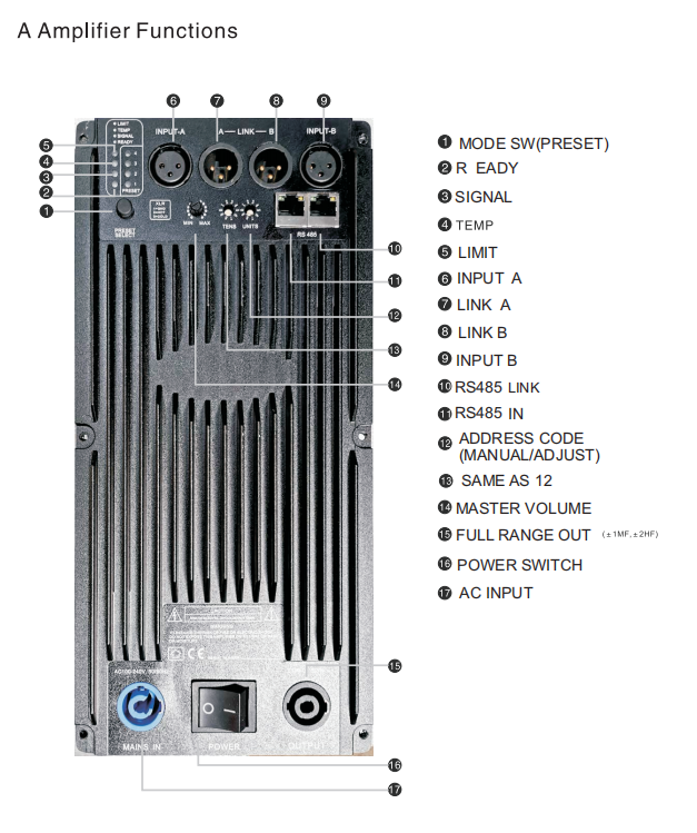 Funciones integradas que incluyen, entre otras, ganancia, nivel, filtrado de paso alto y paso bajo, filtrado de paso total, ecualización paramétrica con todas las funciones, compresor de potencia real, limitador de pico, retardador, etc.