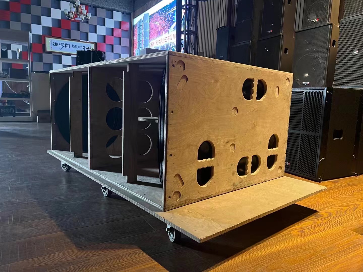 El contrabajo más grande hasta la fecha de Tasso audio utiliza dos potentes unidades de 21 pulgadas con una potencia máxima de 6,8 kilovatios cada una, creando una enorme base de gama baja para el sistema más grande.