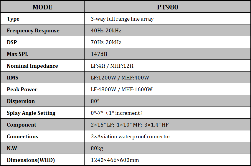 El altavoz debe producir un segmento de onda cilíndrico adecuado para su uso como elemento en un arreglo lineal y mantener un patrón de dispersión horizontal extremadamente preciso hasta frecuencias muy bajas (80°>250 Hz). El altavoz tiene un diseño que exhibe una compresión de potencia extremadamente baja y por esta razón debe utilizar los elementos de montaje traseros como disipador de calor para el controlador de rango medio. El altavoz debe estar compuesto por dos controladores de neodimio de baja frecuencia de 15" en un gabinete ventilado, un controlador de rango medio de 10" con bocina y tres controladores de compresión de salida de 1,4" montados coaxialmente con bobinas de voz de 3" acopladas a un dispositivo de modelado de onda.