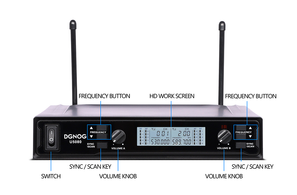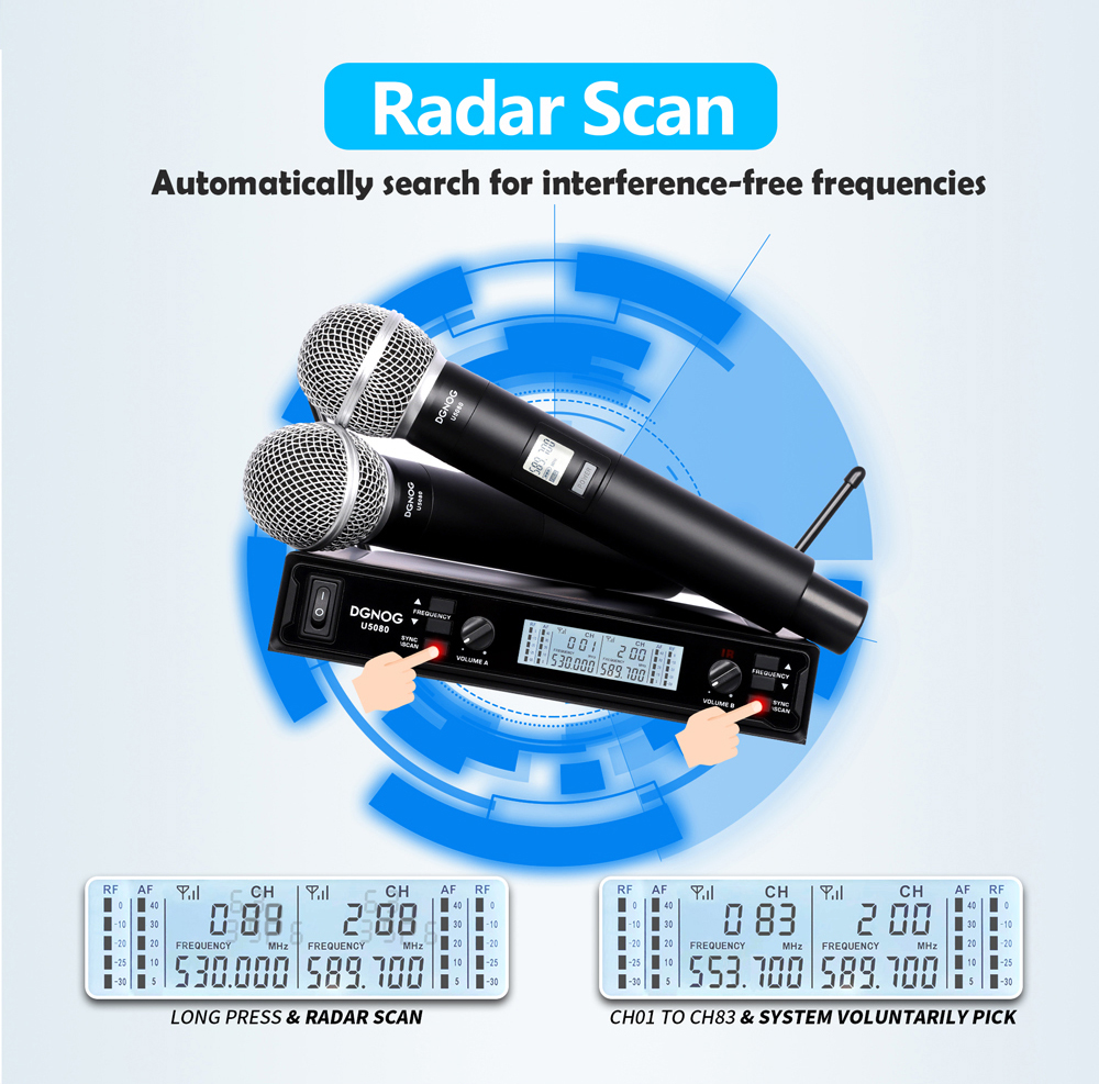 【Frecuencia de escaneo del radar】- Después de presionar el botón de escaneo simultáneo durante mucho tiempo, el receptor escaneará automáticamente el radar para encontrar una frecuencia sin interferencia, haciendo clic en el botón de escaneo simultáneo para coincidir la frecuencia del receptor con un micrófono profesional.