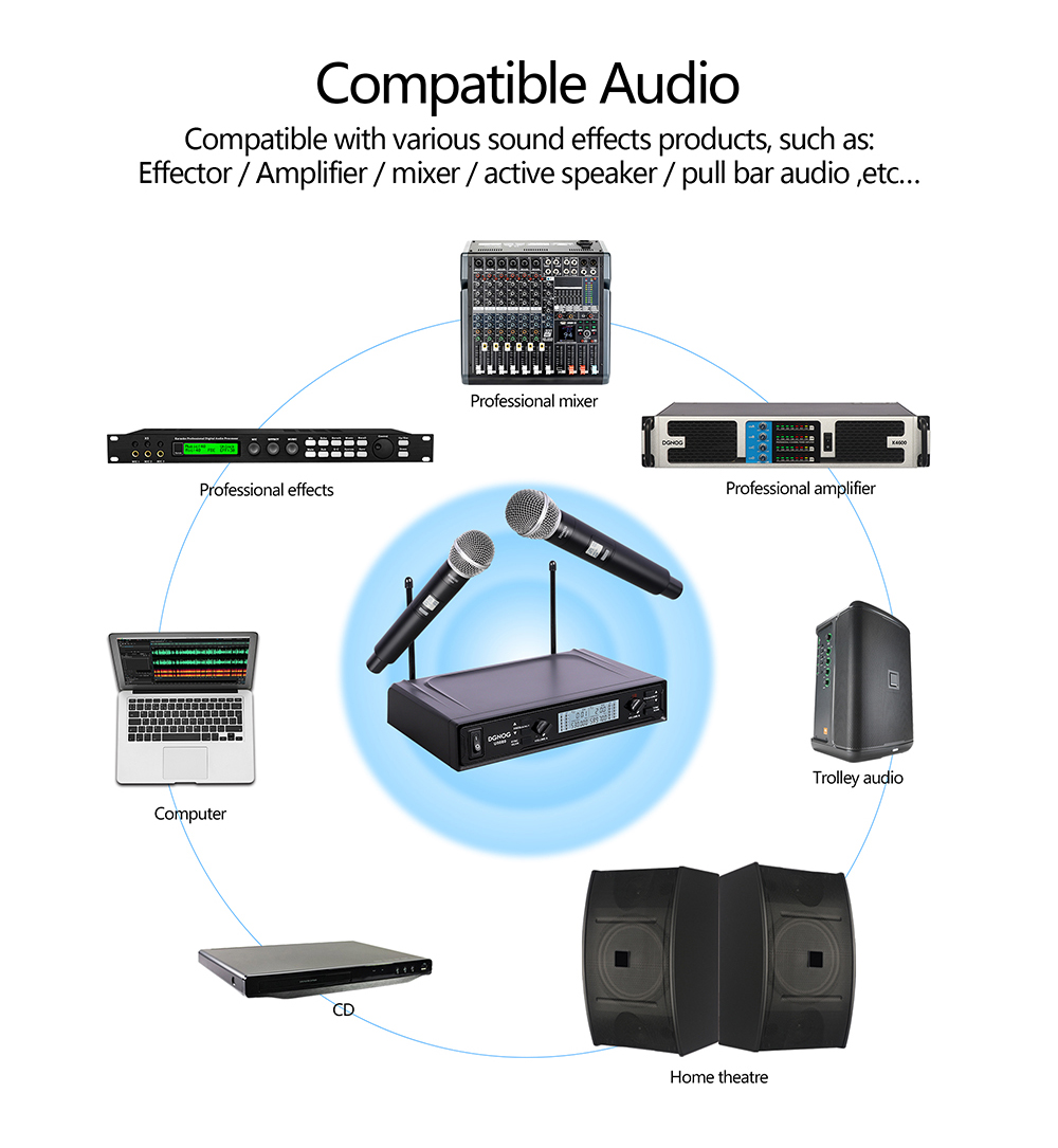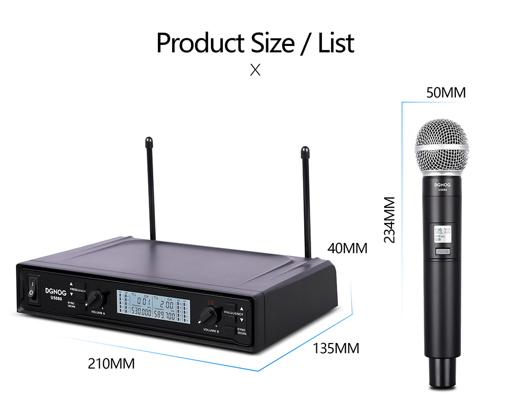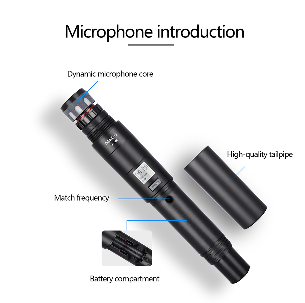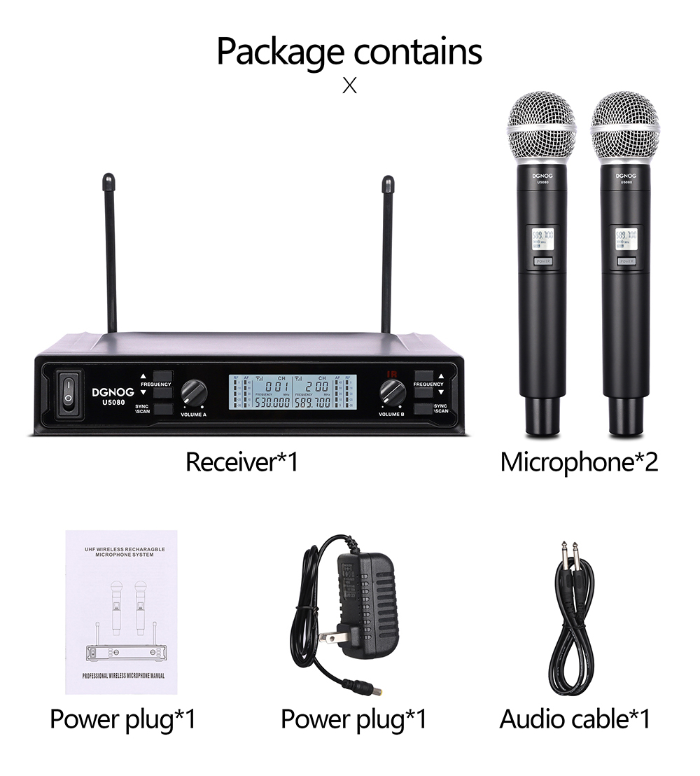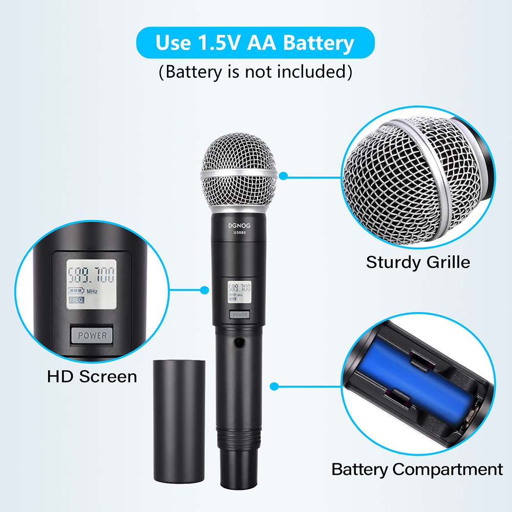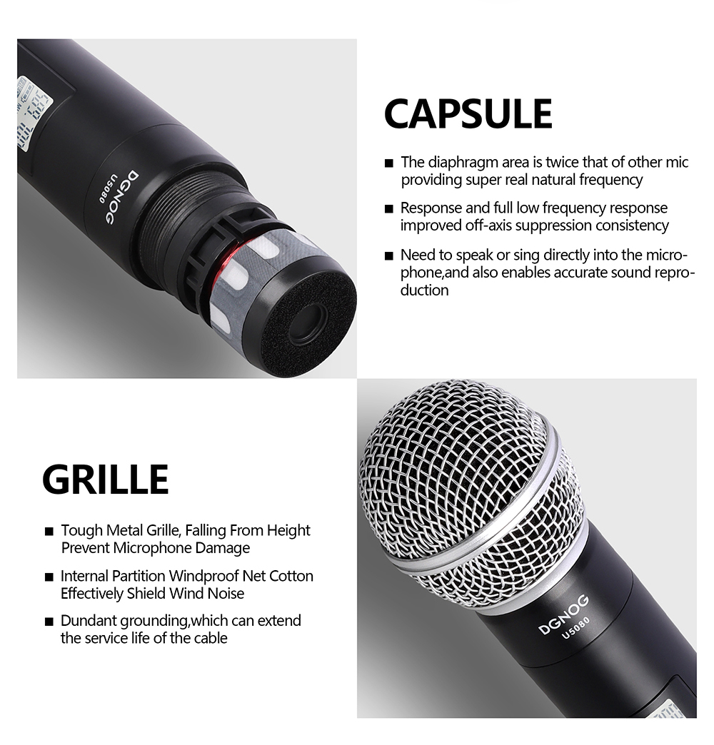 【Calidad de sonido clara y pura】- El sistema de micrófono inalámbrico u5080 está equipado con una bobina dinámica en forma de corazón profesional, que puede reproducir un sonido mejor, claro, puro y completo. Karaoke, fiesta familiar, dj, boda, iglesia.