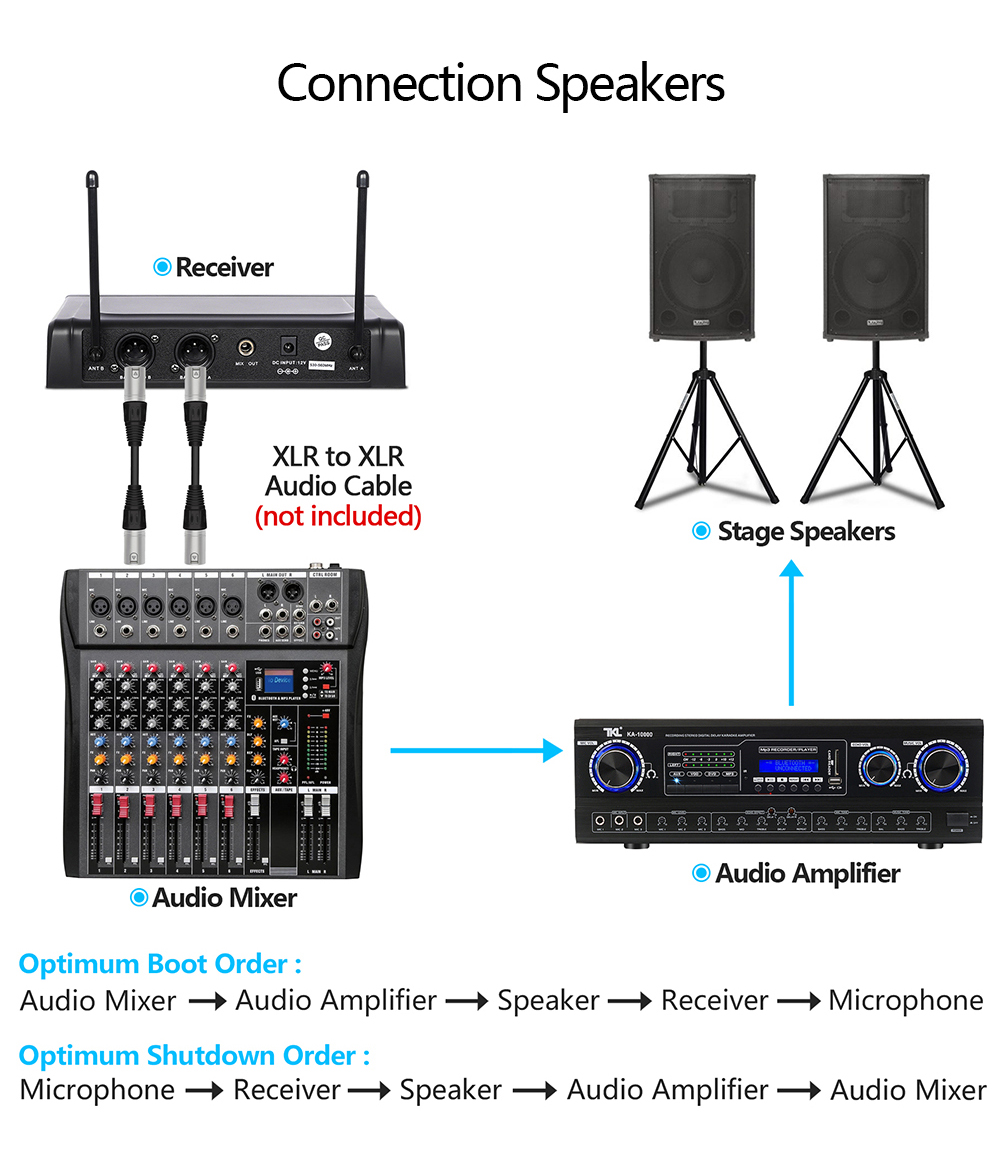 【Fácil de configurar】- Conecte el amplificador o el altavoz (cable de audio de 1 / 4 pulgadas o cable xlr), instale 2 baterías aa (excluidas) en el micrófono y luego encienda el receptor, el altavoz y el micrófono inalámbrico. puede configurar fácilmente el karaoke. nota: no es compatible con computadoras portátiles, ipads, teléfonos móviles y receptores Av.
